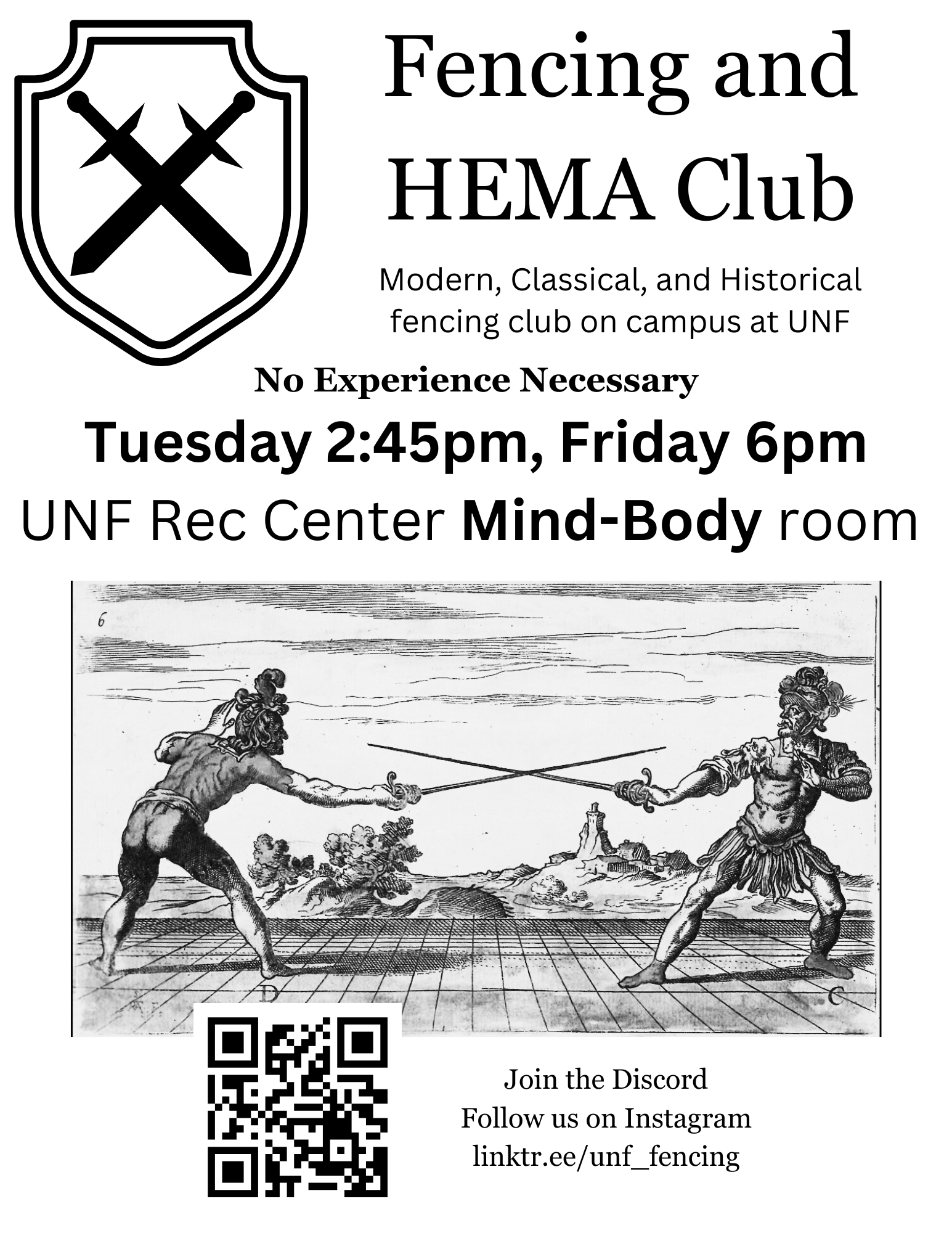 UNF Fencing ClubHistoric to Modern Fencing SchedulePractices Tuesday 2:45PM to 4:45PMand Friday 6pm to 8pm EventsTBD InstructorLuke Heinze ABOUT USWe are the fencing club at UNF